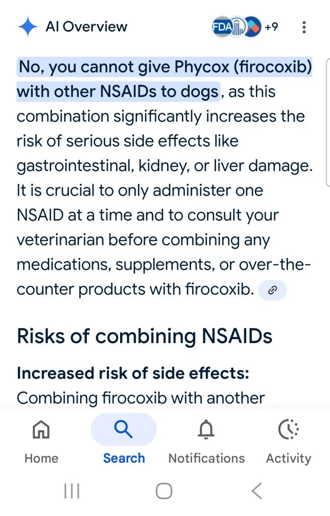 Whoa! Phycox is NOT firocoxib!! Firocoxib is the generic name (or drug name) of the NSAID known as Previcox. These are not the same products! AI conflated the two products. The information given here is incorrect. Now, in this instance, no harm was done because having incorrectly labeled Phycox as another NSAID, AI correctly stated that you should not mix NSAIDs. But what if the opposite had happened? What if someone looked up Previcox and got the information for the wrong product and safely assumed it could be given to a dog already taking another NSAID? Here’s the kicker: if not for the fact that I’m a veterinarian, I might not have known this information was wrong. Potentially fatally wrong.